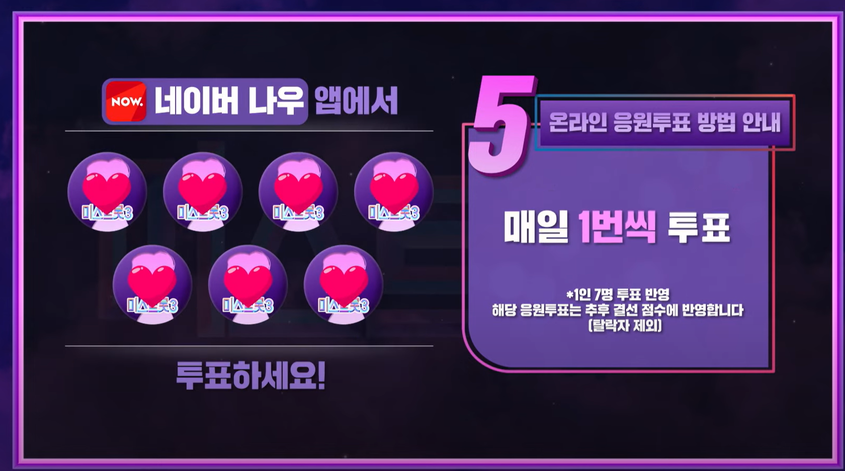 참가자들간의 치열한 경쟁이 벌어지고 있으니, 응원하는 참가자를 위해 매일 투표에 참여해 주세요. 이는 참가자들에게 큰 힘이 됩니다. 결승까지 지속적인 응원부탁드립니다.!