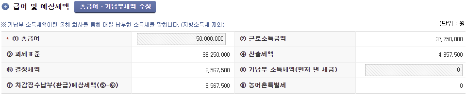 총 급여, 기납부세액 수정을 선택하고 작년 한 해 총 급여액과 기납부세액을 기재하고 적용하면 연말정산 환급금 조회가 됩니다.