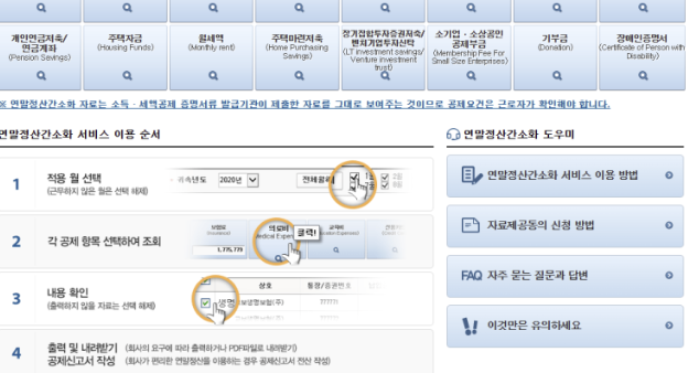 예상세액 계산하기 메뉴에서 '연말정산 간소화 자료선택'한 후 소득 및 공제 항목을 버튼을 클릭한 후 예상세액계산을 클릭합니다.