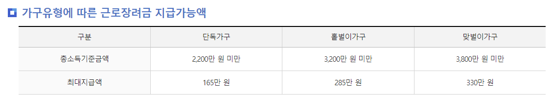 근로장려금 신청자격이 된다면 단독가구는 최대 160만 원, 홑벌이 가구는 285만 원, 맞벌이 가구는 최대 330만 원을 지원받을 수 있습니다.