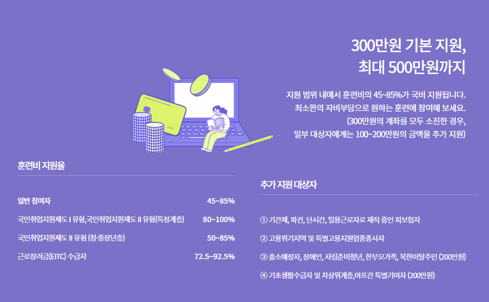 저소득층 및 취업성공패키지 참여자는 추가 지원이 가능하며, 국가기간·전략산업직종 훈련과정 등 특화 과정은 전액 지원됩니다.