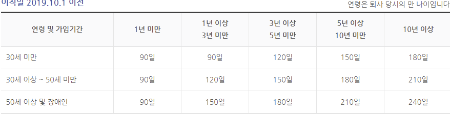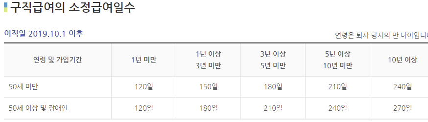 50세 이상 및 장애인의 경우 실업급여 수급기간으로는 1년 미만은 120일, 3년 미만은 180일, 5년 미만은 210일, 10년 미만은 240일, 그 이상은 270일입니다.