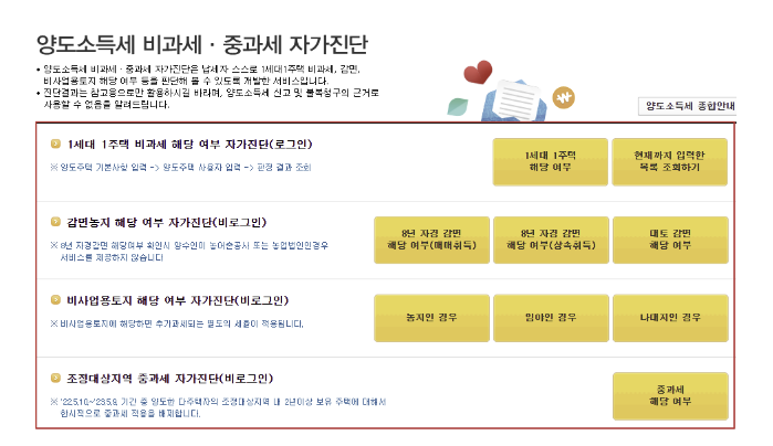 이를 위해 홈택스에서는 양도소득세 자가진단 서비스를 제공하고 있습니다. 이를 통해 간편하게 양도소득세 비과세, 중과세 여부를 확인할 수 있습니다.