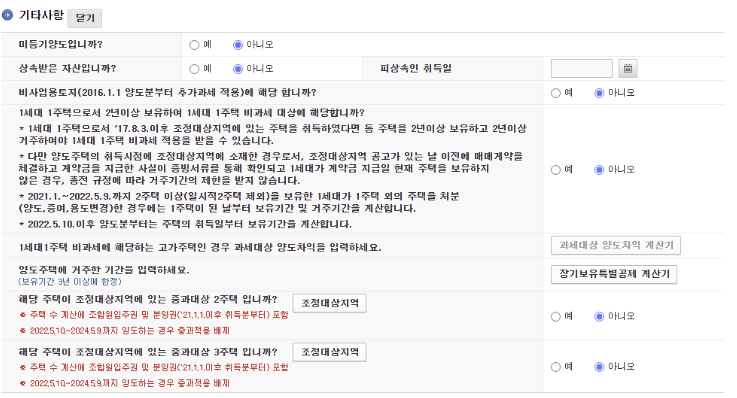 이후 기타 사항에서는 장기보유특별공제와 조정대상지역 여부를 입력해 줍니다.