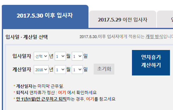 정확한 연차 휴가일수를 계산하고 싶다면 연차 계산기를 이용해서 계산해 보시기 바랍니다. 연차 계산기에서 입사일자만 입력하면 자동으로 연차휴가일수가 계산됩니다.