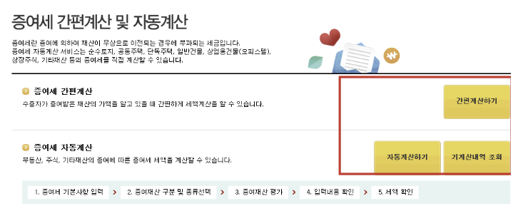 다행히 국세청 홈택스에서는 증여세를 스스로 계산해 볼 수 있도록 증여세 간편 계산 및 자동계산을 제공하고 있습니다.