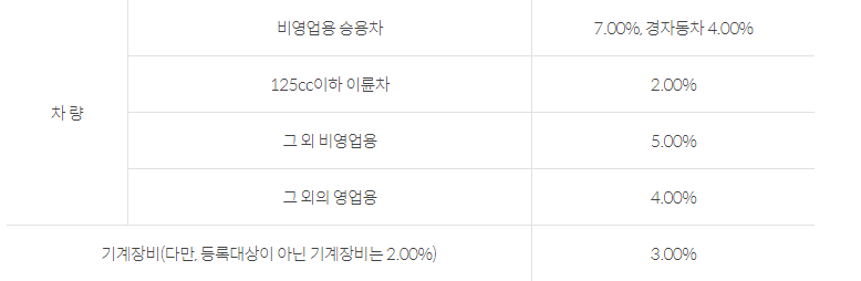 영업용 자동차 취등록세율은 4%, 화물차는 5%, 11인승 이상 승합차 세율은 5%, 경차는 4%, 7~10인승 승합차는 7%의 취득세율이 적용됩니다.