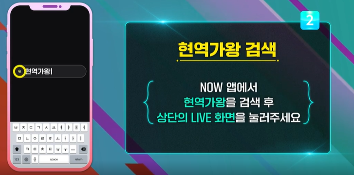 앱 설치과 완료되면 '현역가왕'을 검색하면 라이브 화면이 나타납니다. 해당 페이지에서 실시간 채팅 화면에 있는 모래시계 아이콘을 누르면 현역가왕 투표 페이지로 이동합니다.
