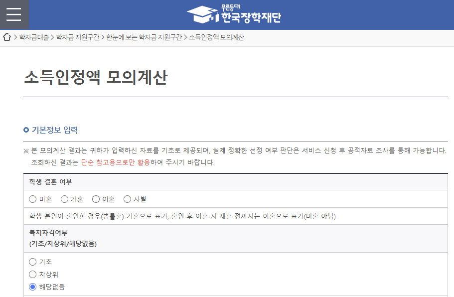 한국장학재단에서 제공하고 있는 소득인정액 모의계산이기 때문에 무엇보다 신뢰할 수 있습니다.